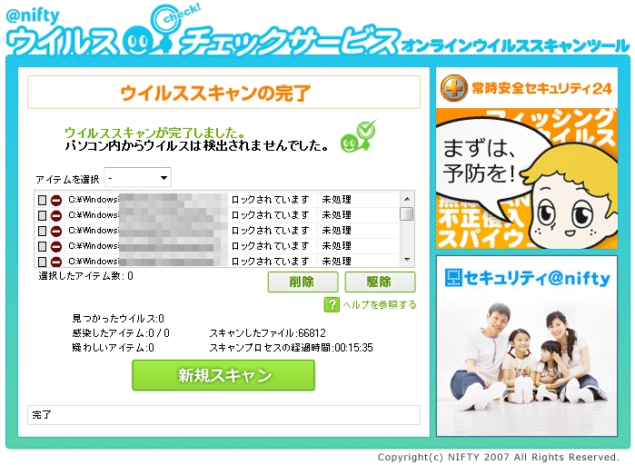 今回はホームページ閲覧中にJAVAらしきものが動き始めて なにかEXEファイルが実行されようとしたので、もちろん実行を中止しました。 しかしながら、複数のファイルがC:¥ユーザー名¥AppData¥Local¥Tempフォルダ内に 進入しており、自動的に実行を繰り返していました。 タスクマネージャーで実行ファイルを停止し、上記フォルダ内を削除。 このフォルダ内を全部削除したためか、ウイルスに感染したためか タスクバーからタスクマネージャーが起動しなくなる。 (Ctrl+Alt+Delからの起動は可能) その他、実行ファイルの一部が起動できなくなったため F8起動でのシステムの復元を実行。 タスクマネージャーの動作を確認したため、念のため @niftyで無料で行えるオンラインウイルスチェックを実行。 (ここは、カスペルスキーを使用しているようなので、検出確率が高いかも?) すべてを対象にすると時間がかかりそうなので、システム系中心の 一般的なほうを選択して、チェックした結果が下の通りです。 とりあえず、復旧完了といいたいところですが 若干不安も残りますので、後日全体に対する ウイルススキャンを行いたいと思います。 まさかの事態にちょっとびっくりでした。 これがうわさのガンブラーなのでしょうか...? ちなみに、ウイルスバスターは不要と思っている人でありながら、変な? アクセスブロックソフトを入れたりしてましたが、今回の件でちょっとだけ マイクロソフト以外のウイルス対策ソフトをいれようかなーと思いました。 みなさんは、基本的に対策されている方ばかりだと思いますが 十分にご注意ください...。