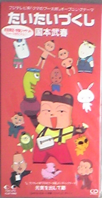 パッケージを見ると分かる人もいるかもしれませんが 「クマのプー太郎」の主題歌「たいたいづくし」です。 単純に歌がおもしろかったので買ったのですが 男性のCDを買うのはめずらしいですね。 しかも、かっこいいからではなく、おもしろいからという 理由で買ったのは、ほかにあったでしょうか? しかし、国本武春とかぜんぜん知りませんよ。(笑) ちなみに、Wikiで調べたところ、浪曲師らしいです。 なんか、「あにゃまる探偵キルミンずぅ」にも出ていたらしく、びっくり。