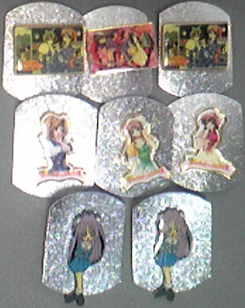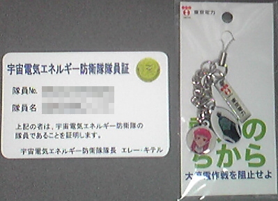 Piaキャロットへようこそ2ピンズとファーストキス物語ピンズ。 ゲーマーズ福袋に入っていたような...? 使うことはないだろうし、捨てるかどうか。 ラブひなピンズセット。 これはもらったような...? これまた、捨てるかどうか。 バーチャファイター4カードとカードケース。 PS2バーチャファイター4の購入特典だったかも。 結局アーケードは、あんまりやらなかったので 全く使っておりません。 欲しい人にはプレゼント。 宇宙電気エネルギー防衛隊隊員証とストラップ。 東京電力のホームページで電気に関するゲームが有り クリアすると先着?(全員?)でもらえたもの。(笑) どこかのホームページで紹介してあって、本当は子供向け なのに、いい大人が結構もらっていた様子。 ボーダフォンステッカー。 なんでもらったか不明。 最初の携帯はJ-PHONEで次がSoftbankだからVodafoneは 使ってないはずなのに。 ちなみに、どこかに貼ろうと思ってましたが、ついさっき捨てました!