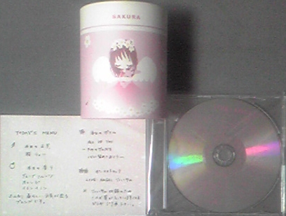ちなみに、たしかSAKURAかANGEL名義のときに 通販専用(だったと思います)でCDの販売があり そのときに購入したのが、これです。 真ん中に筒のようなものがありますが、中身は紅茶です。 はい、紅茶です。 中の用紙に桜ティーと書いてあるので、桜の香りの紅茶と思われます。 しか~し、これ通販したのが2002年ですよ。(笑) 中身の紅茶の賞味期限は2004年3月...。 さて、どうしましょうかねー...。